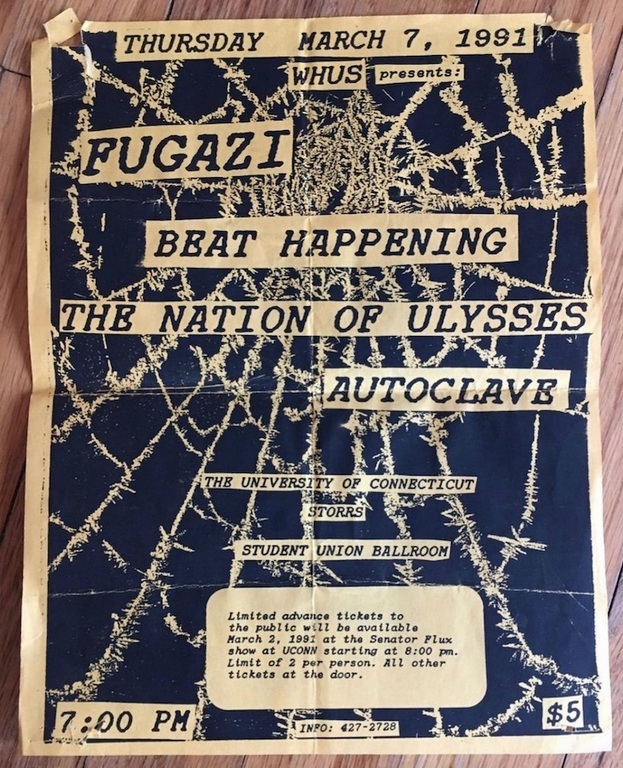 My first Fugazi show: almost two years ( ! ) after buying "Margin Walker" on cassette at Record Express in West Hartford Center and finally getting hip to what my more "avant-garde" friends had discovered earlier. As usual. Memories of the show: too many people crammed in a hot, dark, low-ceilinged student center; Guy and Ian seeming to get pissy with each other (as well as with the audience) ; going to sleep that night with my ears still profoundly ringing.